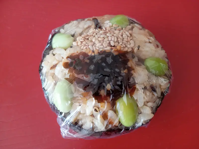 こんぶ佃煮、きざみ沢庵、枝豆の混ぜご飯のおむすびです。
