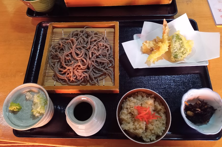 こちらは温・冷から選べる板蕎麦(小)と小鉢・天ぷらの盛り合わせ・鶏飯のセットです。