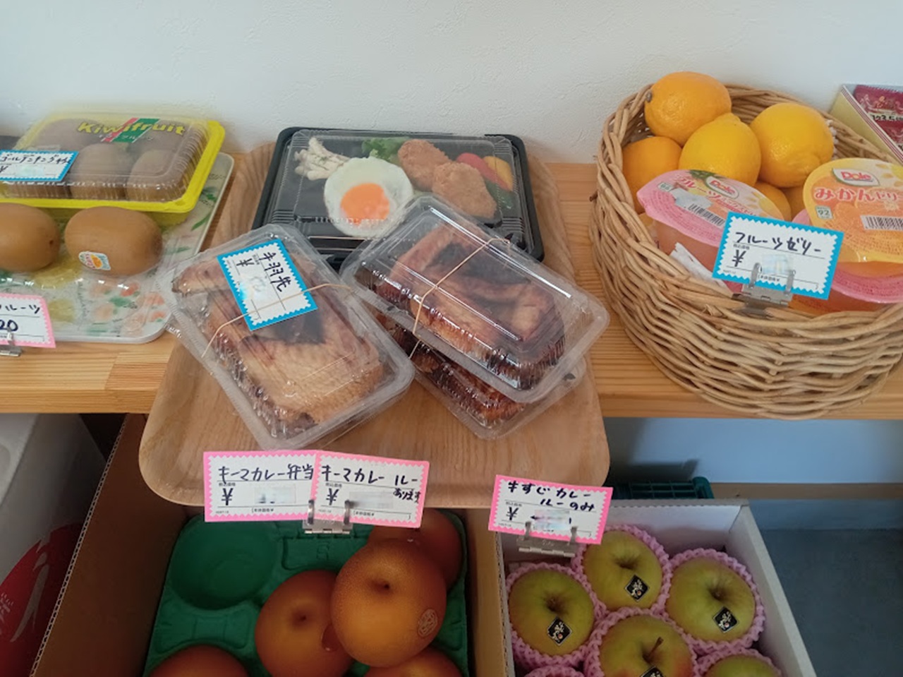 こぢんまりとしたお店の中には様々な商品が並んでおり、野菜や果物の他、お弁当、パンやケーキ、プリン、ドリンクなどの販売もしています。