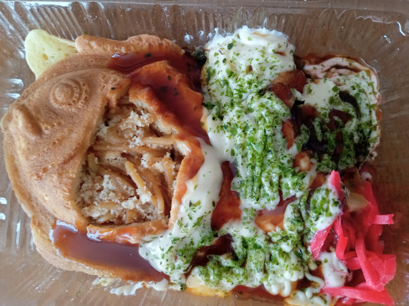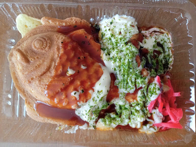 たい焼きの中に焼きそば麺が入っていて、たっぷり「お好み焼きのたれ」と思われる「たれ」がかかっていました。