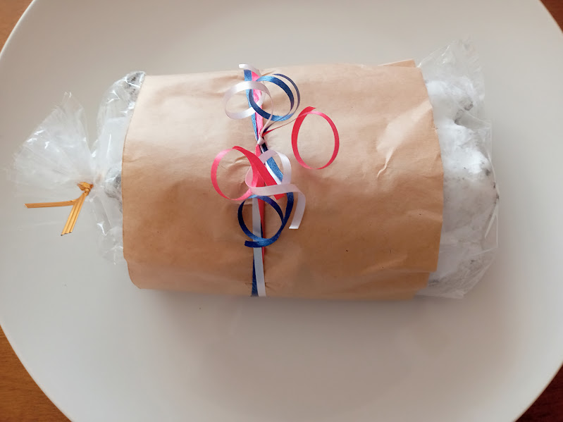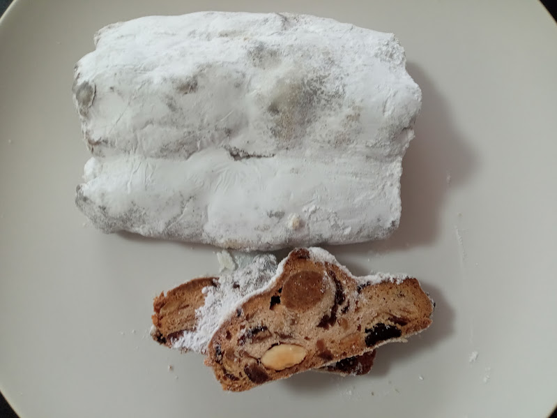 バターたっぷりの生地に、レーズン・オレンジピール・レモンピール・ドライアップル・ドライいちじく・ドライクランベリー・くるみ・アーモンドなどを練りこまれており、表面には、たっぷり粉砂糖がまぶされていました。