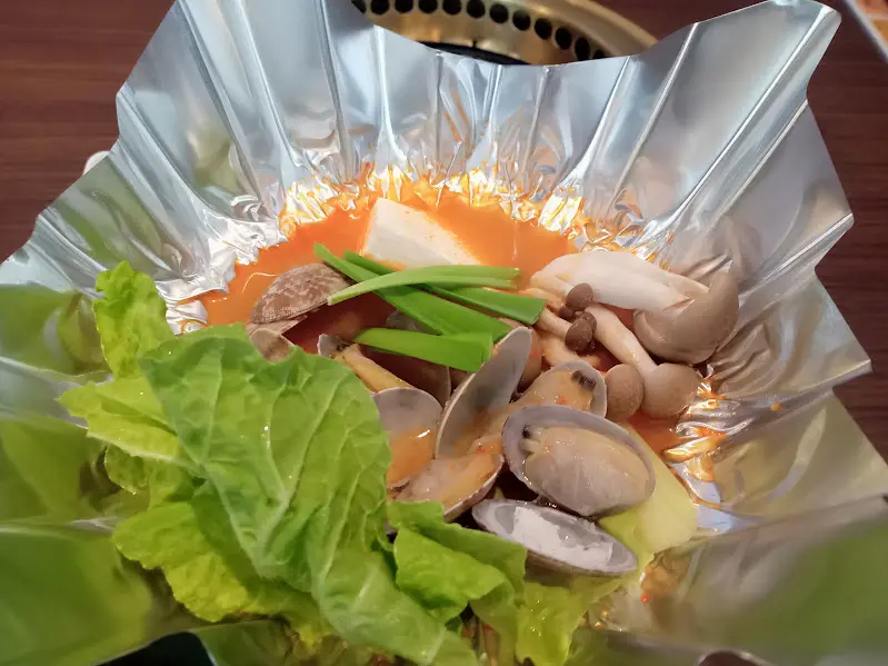 アサリの旨味が効いた「チゲ」の下には、固形燃料がおいてあり野菜に火が通ってからいただきました。