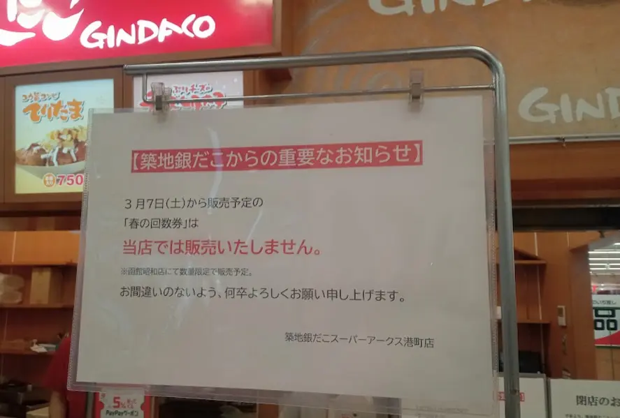 3月7日(土)から販売予定だった「春の回数券」も『築地銀だこスーパーアークス港町店』では販売しないそうです。