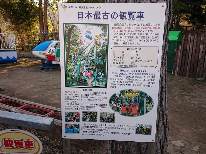 遊園地の中には『登録有形文化財』に登録されている日本最古の観覧車「空中観覧車」があり、修学旅行生(小・中学校)は、函館の歴史を知ってもらうために「空中観覧車」に無料で乗れるそうです。