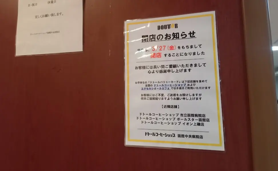 【函館市】2026年3月27日(金)で『ドトールコーヒーショップ 函館中央病院店』が閉店するそうです