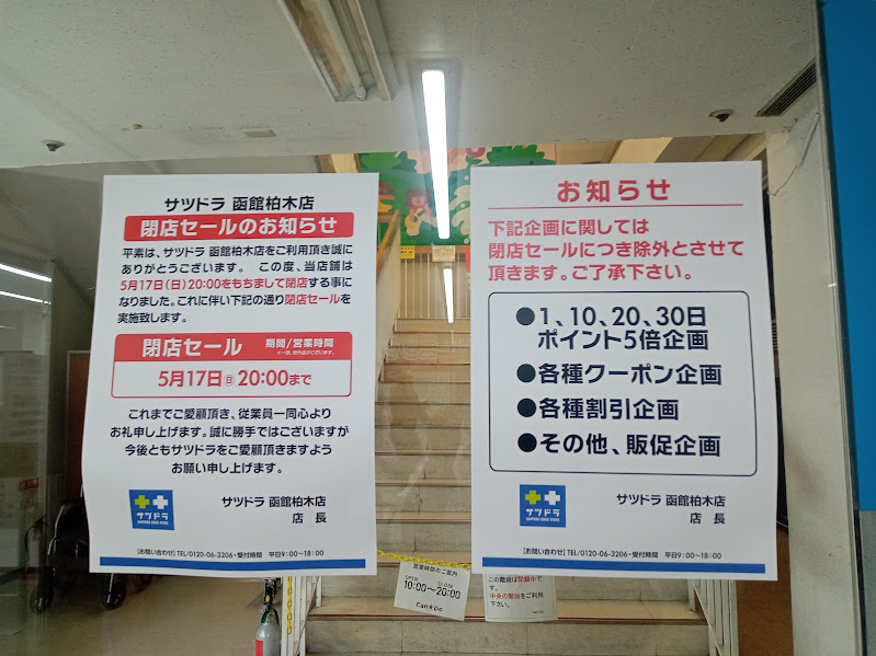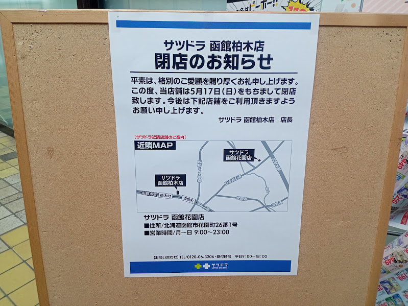 【函館市】2026年5月17日(日)で柏木町にある『サツドラ函館柏木店』が閉店するそうです